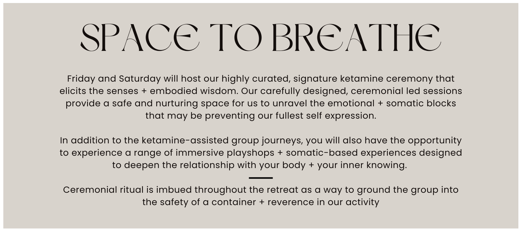 Which is why we ask that you fill out the application + one of our lead therapists will contact you for a one-on-one conversation regarding fitness for ketamine-assisted therapy and what you’ll experience at the retreat.